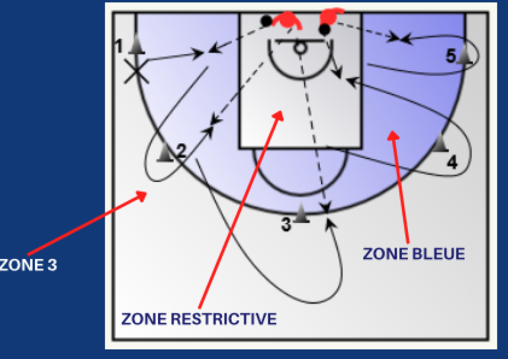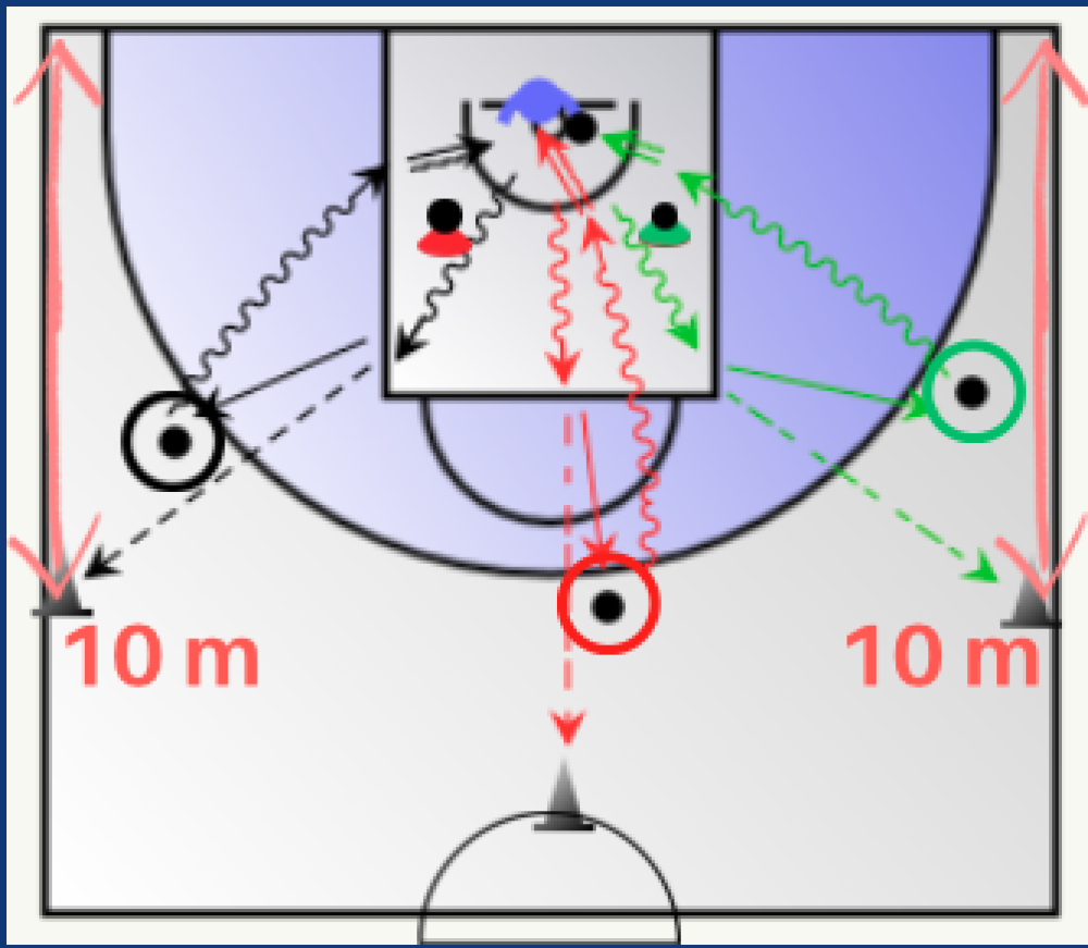 DÉROULEMENT : Tir sans dribble après réception au plot n°1, puis enchaînement aux plots 2, 3, 4 et 5. Le joueur recommence au plot n°1 tant que le temps n’est pas écoulé.