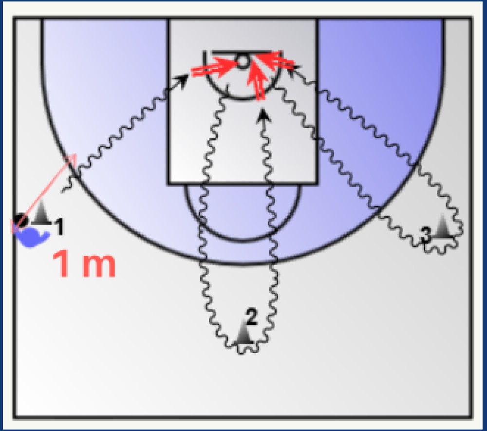 DÉROULEMENT : Le joueur démarre au plot n°1, réalise un tir en course, récupère son ballon puis enchaîne vers les plots n°2 et n°3. Il répète le circuit jusqu’à la fin du temps.